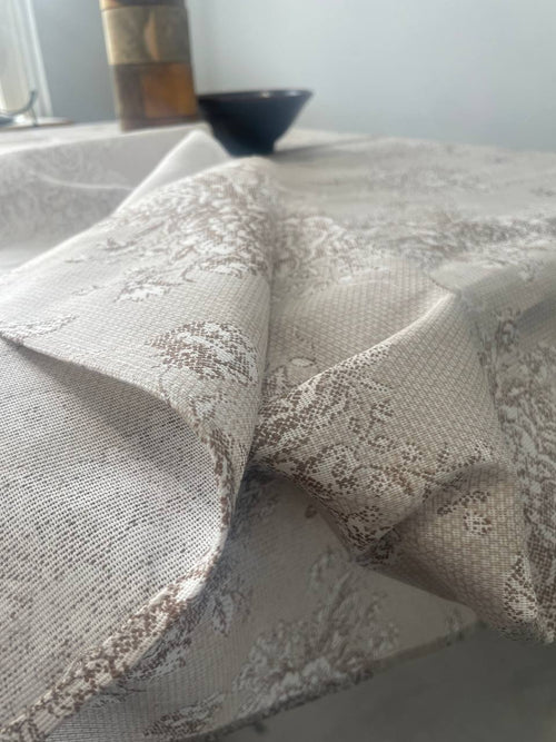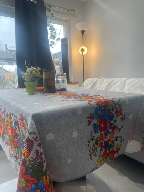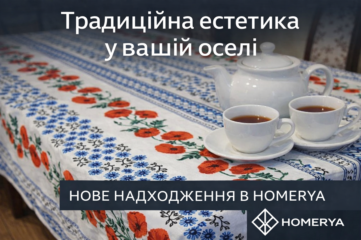 Скатертина виготовлена з натуральної тканини з фактурою льону та об’ємною вишивкою.